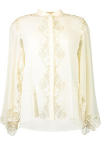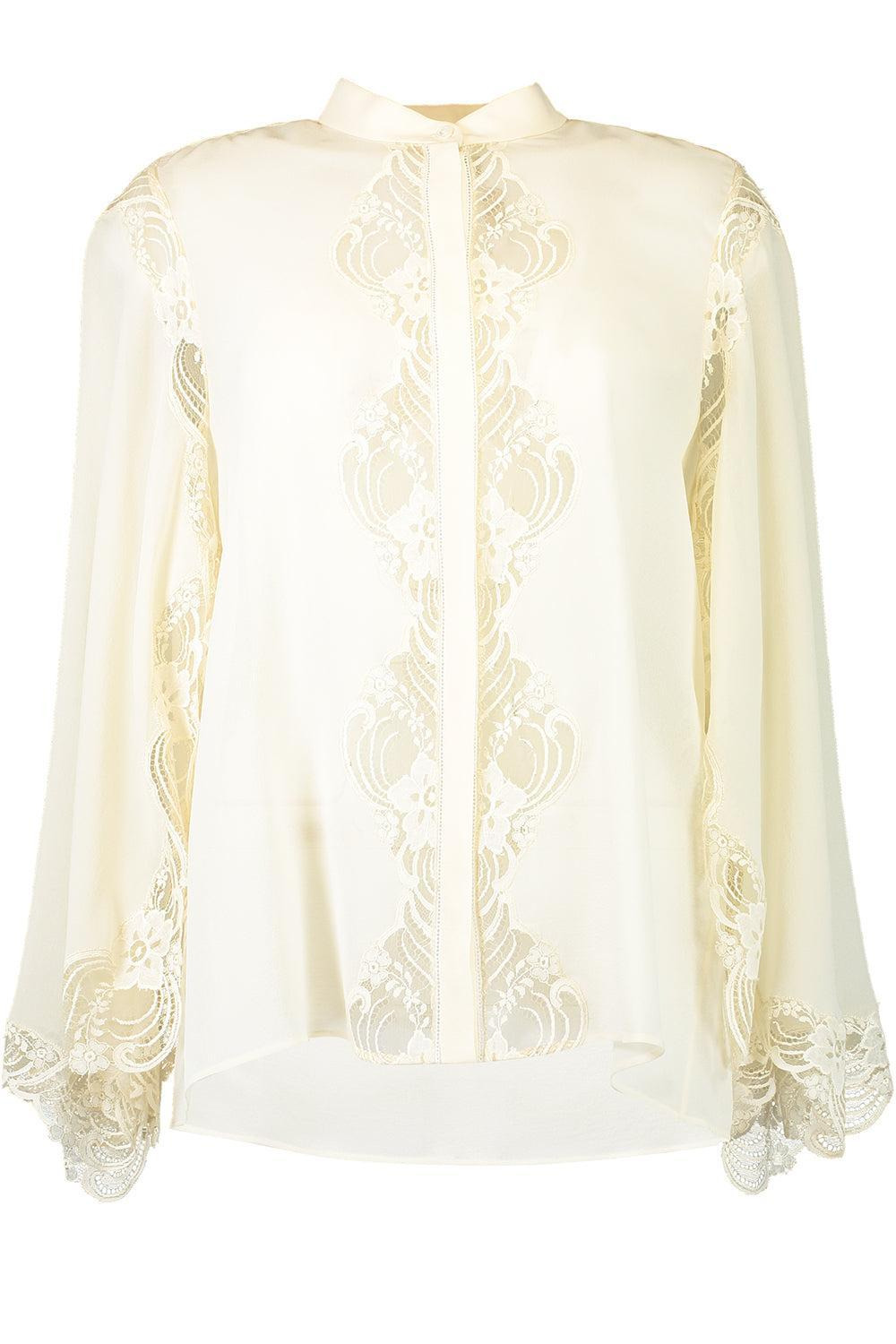 DETAILS AND INSIGHT Chloe fluid blouse in pristine white. Lace-Trimmed Silk Blouse, Mother-Of-Pearl Buttons Through Front 100% Silk Dry Clean Only Imported Style CH25AHT33117-114