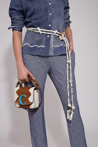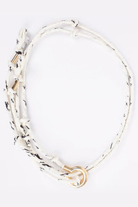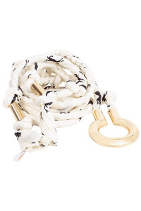 DETAILS AND INSIGHT Horse print rope belt by Chloe. This twisted and knotted rope belt features black woven silk accents, an oversized gold tone c-shaped buckle and an adjustable knot closure. Wrap it around your waist over a slim fitting jumpsuit. 56” x ¼” Made in Madagascar Available in Dust/White Style CHC19UACO1346-115
