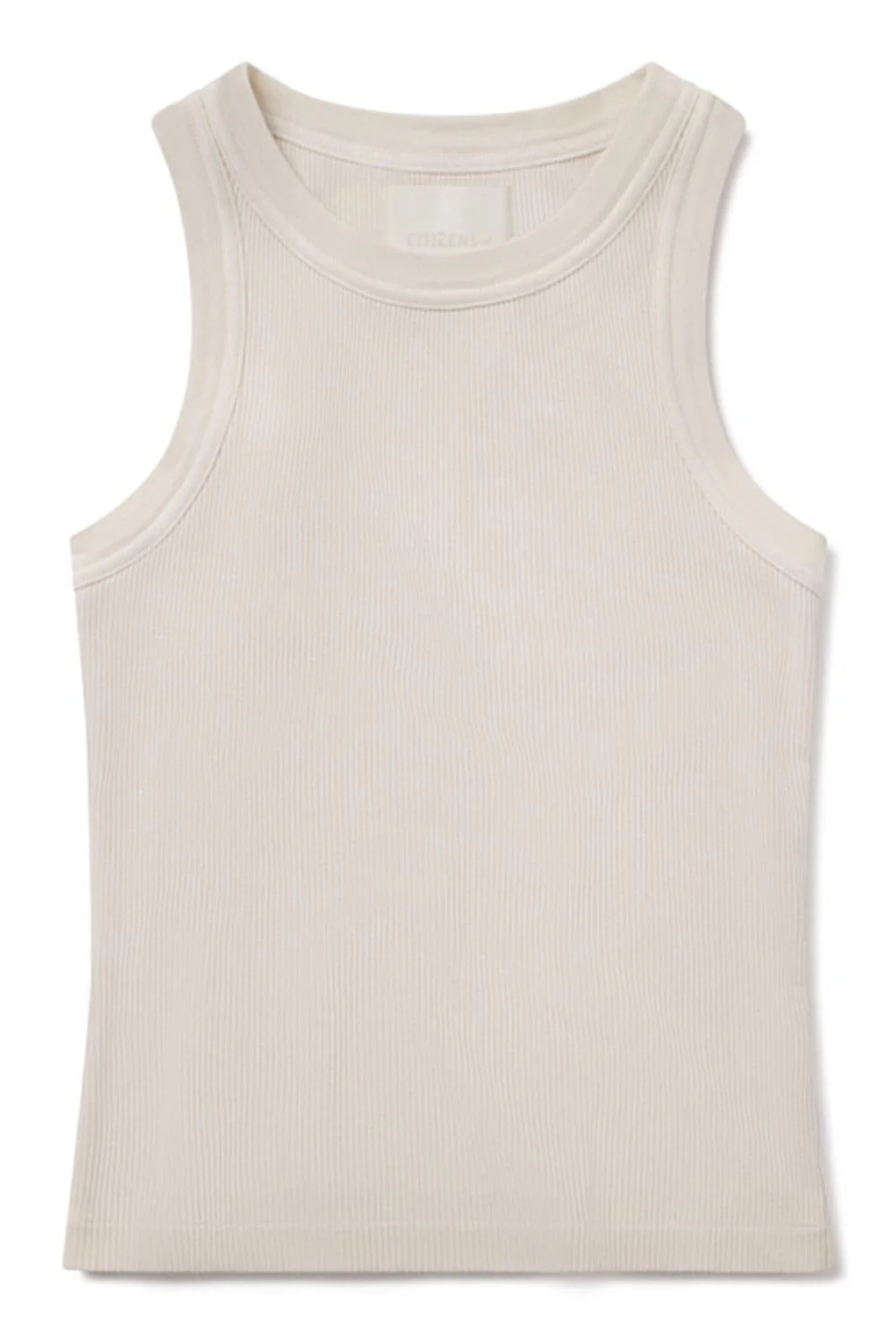 DETAILS AND INSIGHT Citizens Of Humanity isabel rib tank in dune. 49% Tencel Lyocell 49% Organic Cotton 2% Spandex Machine Wash Cold Made In Usa With Imported Materials Style 9201-3004-DN