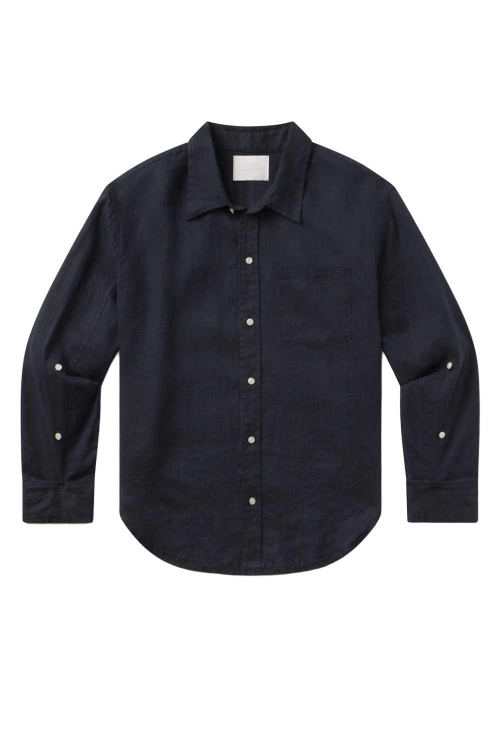 DETAILS AND INSIGHT Citizens Of Humanity kayla shrunken button down top in navy. 100% Cotton Machine Wash Cold Inside Out With Like Colors. Do Not Bleach. Tumble Dry Low. Made In Turkey Style 9293-1680-TRU NVY