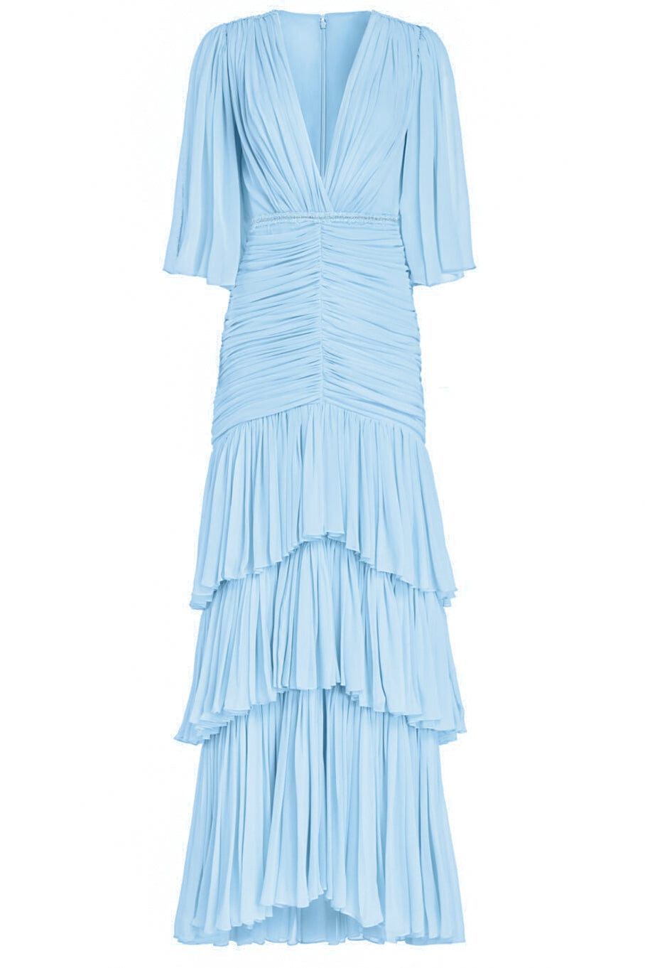 DETAILS AND INSIGHT Costarellos kelsey silk chiffon v neck dress in powder blue. 100% Silk Dry Clean Made in China Style SS22 44 KELSEY