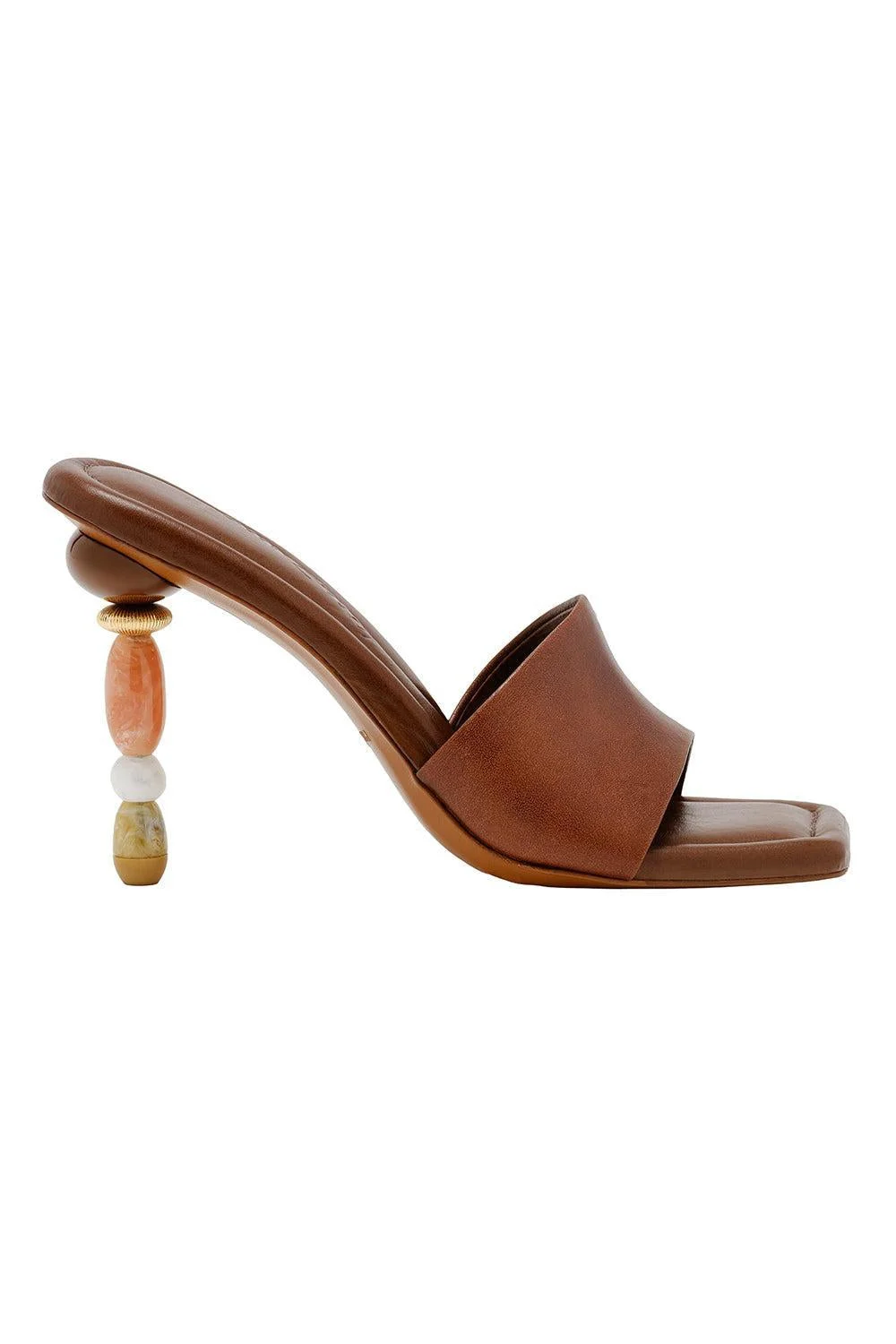 DETAILS AND INSIGHT Cult Gaia mahina sandal in saddle. Upper: 100% Cow Leather, Outsole: 100% Reconstituted Leather Spot Clean Made In Br Style SD3466LR2633-SADDLE