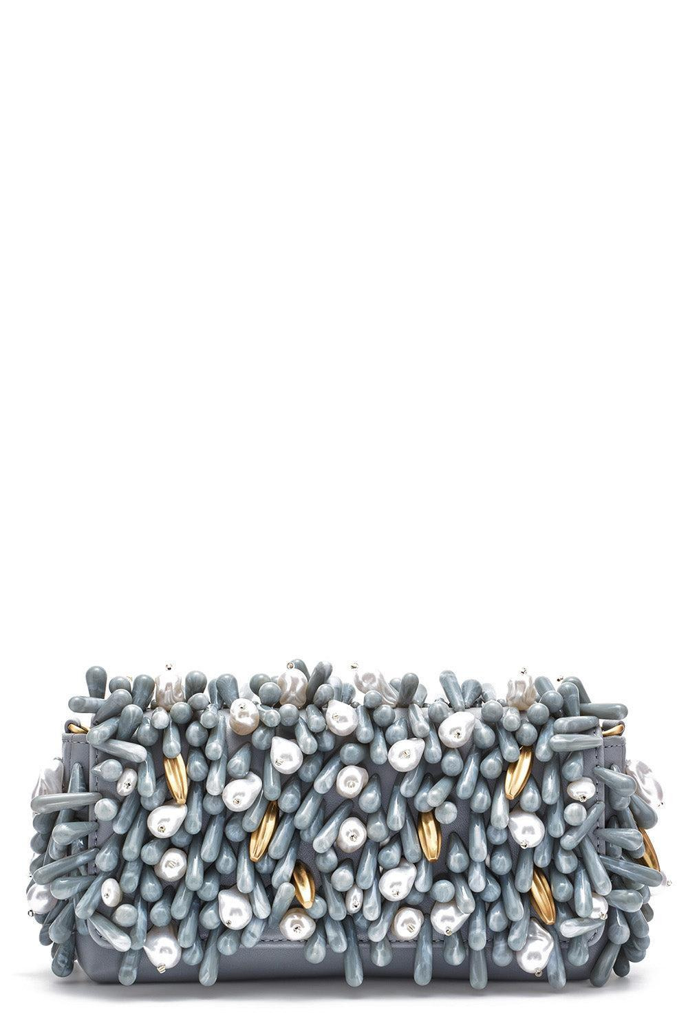 DETAILS AND INSIGHT Cult Gaia perla clutch in celadon multi. 100% Sheep Leather; 100% Acrylic Beads; Lining: 100% Polyester; Hw: 100% Zinc Alloy Spot Clean Made In Cn Style CL1832BD3353-CELADON MULTI