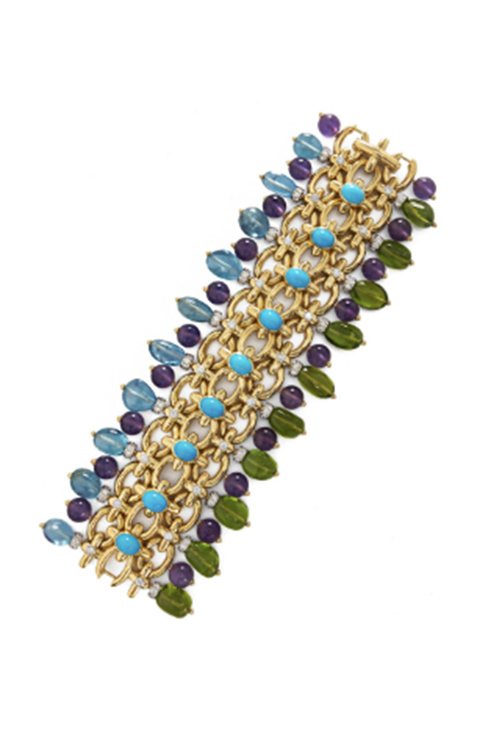 DETAILS AND INSIGHT David Webb aquamarine peridot diamond brocade bracelet in yellow gold. 18K Yellow Gold, Platinum 4.83Ctw Diamonds, 12.15Ctw Turquoise, 38.11Ctw Aquamarine Style PS22360197B-7
