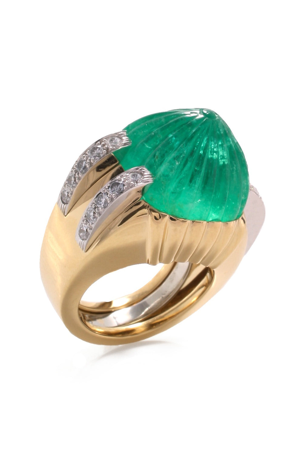 DETAILS AND INSIGHT David Webb emerald diamond channel ring in yellow gold. 18K Yellow Gold, Platinum 0.85Ctw Diamonds, 25.24Ctw Emerald Style MS428-32465R-PYXEX