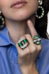 DETAILS AND INSIGHT David Webb green octogonal buckle ring in yellow gold. 18K Yellow Gold, Platinum, Enamel 2.53Ctw Diamonds Style OS3-30110R