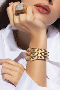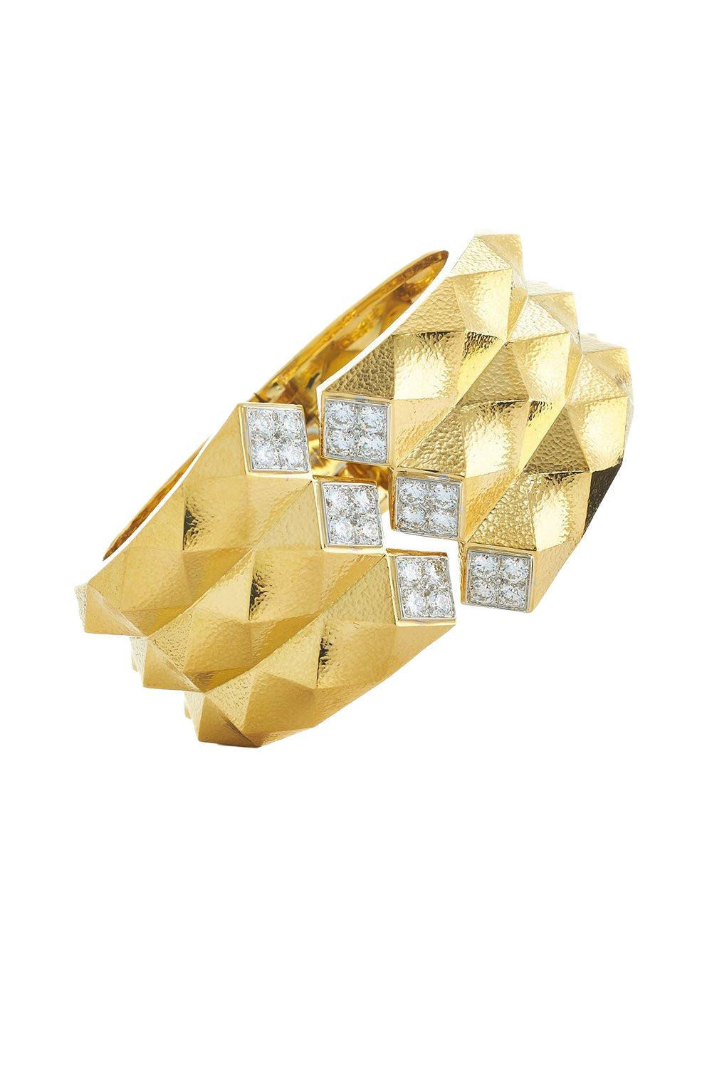 DETAILS AND INSIGHT David Webb hammered origami cuff bracelet in yellow gold. 18K Hammered Yellow Gold, Platinum Brilliant-cut diamonds 2.40 cts Style NS23-60523B-2