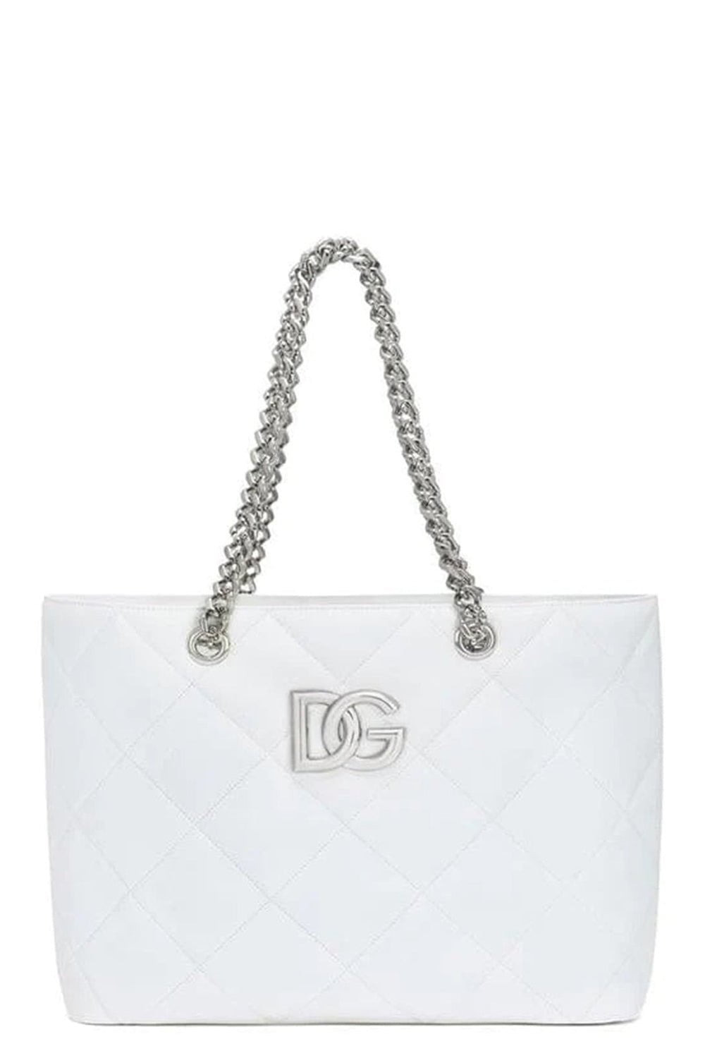 DETAILS AND INSIGHT Dolce & Gabbana quilted tote with chain straps in bianco. 100% Leather Length: 30' Height: .25' Depth: 14' Made in Italy Style BB7178 AB339