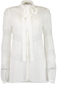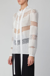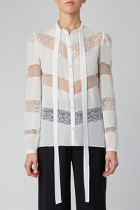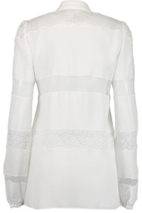 DETAILS AND INSIGHT Elie Saab crepe de chine lace long sleeve shirt in optic white. 97% Viscose 3% Elastane Dry Clean Made in Italy Style 13206