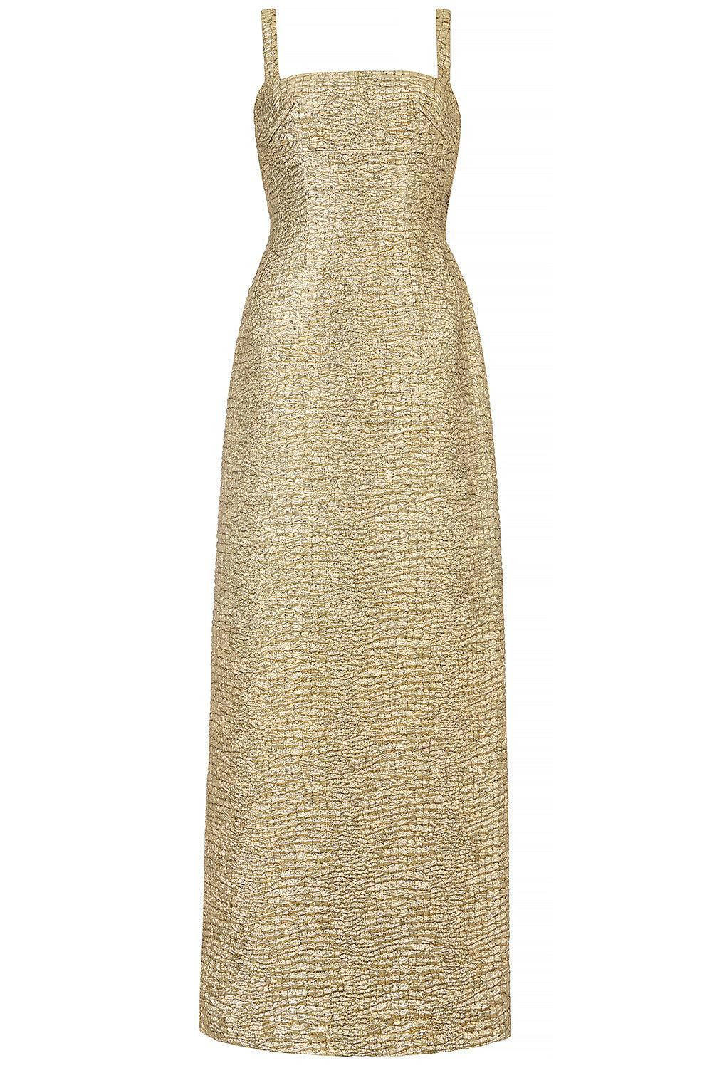 DETAILS AND INSIGHT Emilia Wickstead micheline dress in gold. 39% PL, 37% PM, 2% PA; Lining: 100% Polyester Dry Clean Made in London Ships by Nov 21 Style AW25-OCC-02-982 MICHELINE-532