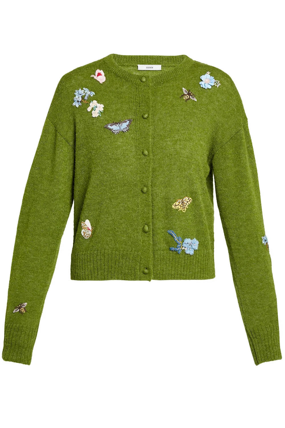 DETAILS AND INSIGHT Erdem crew neck cardigan in apple green. 38% Alpaca 21% Wool 41% Pa Delicate Dry Clean Made In China Style PS26_KT40_30033015-APPLE GRN