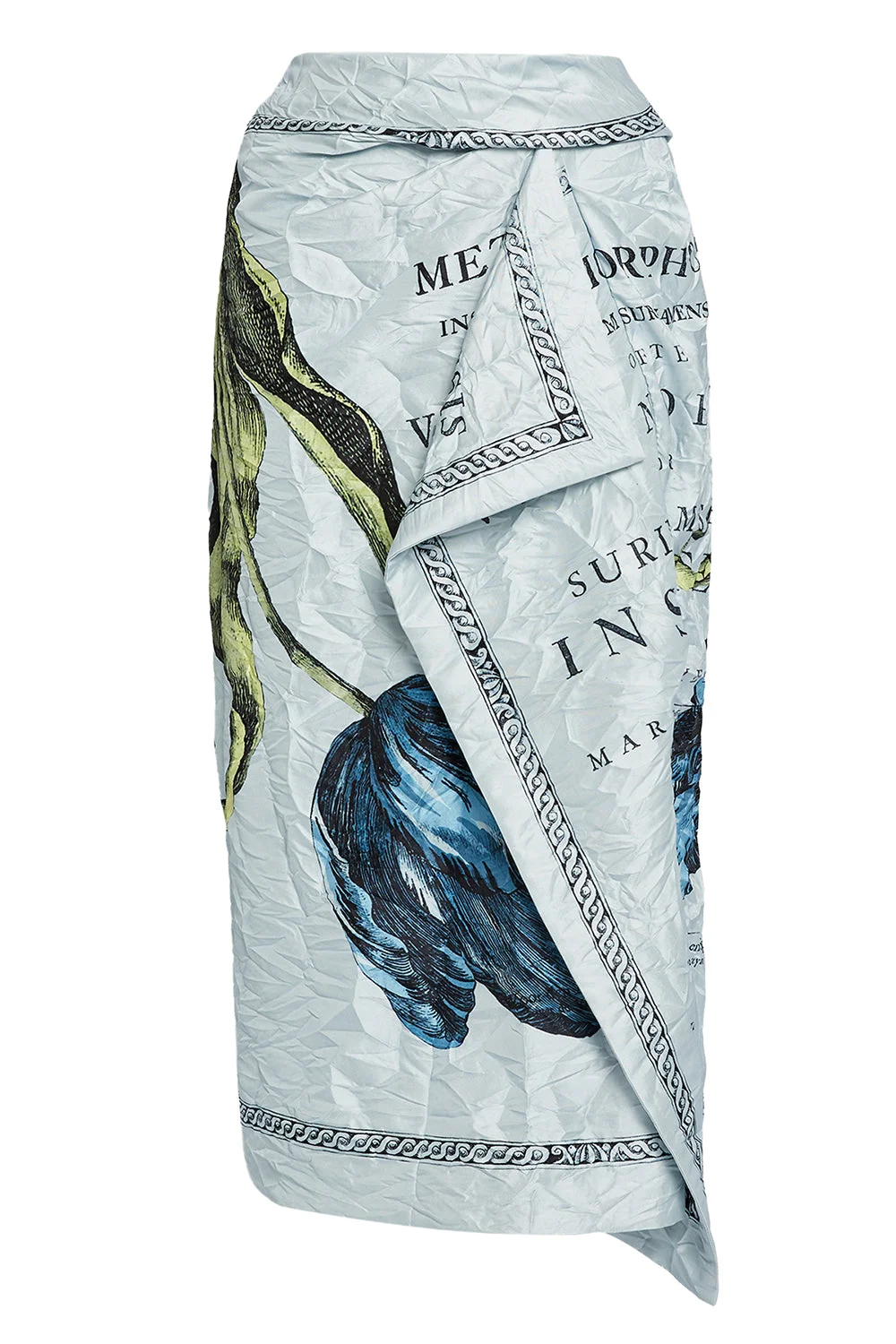 DETAILS AND INSIGHT Erdem draped midi skirt in etched tulip powder blue. M: 100% Polyester, L: 100% Silk Delicate Dry Clean Made In Portugal Pre-Order Ships by Feb 22 Style PS26_S16R_51414015-ETCHTULPW