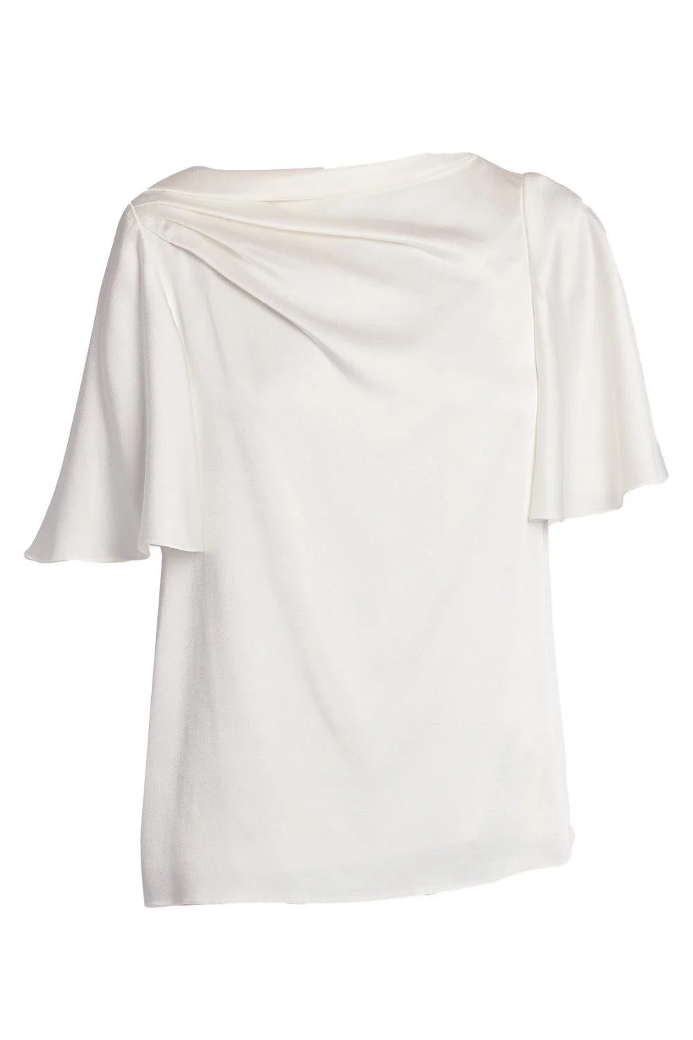 DETAILS AND INSIGHT Erdem draped short sleeve top in ivory. M: 71% Acetate 29% Viscose L: 100% Silk Dry clean Made In Bulgaria Ships by March 29 Style SS25_T32_IVFCA-IVORY