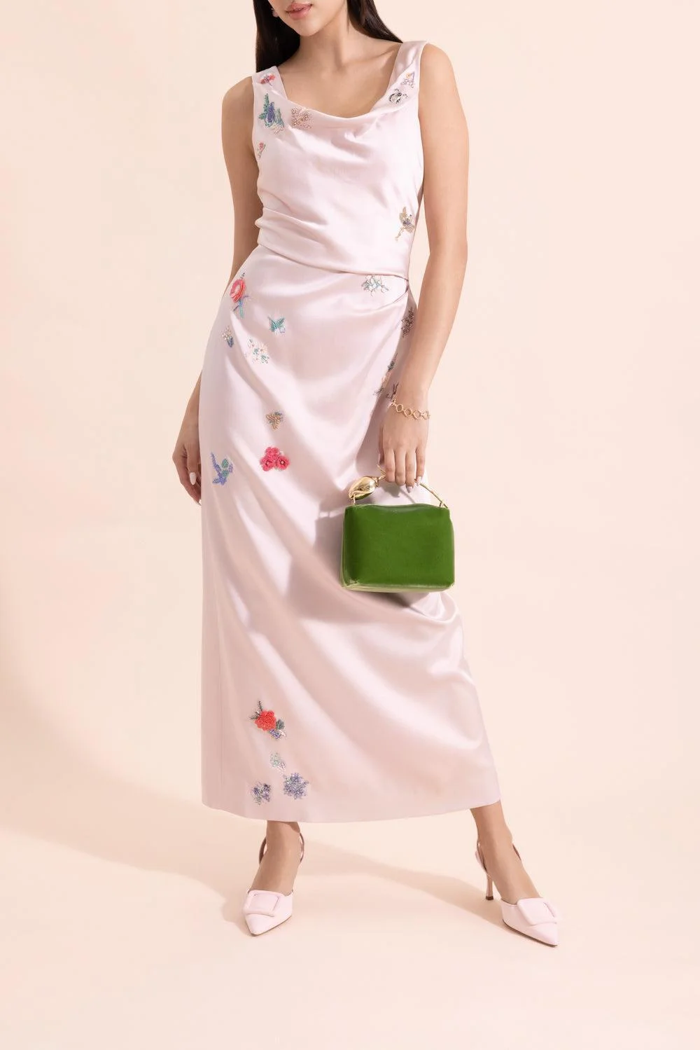 DETAILS AND INSIGHT Erdem embellished sleeveless cowl neck midi dress in cameo pink. 71% Acetate, 29% Viscose; Lining: 100% Silk; Embroidery: 50% Glass, 50% Polyester Dry Clean Imported Style PS26_D203_50255013