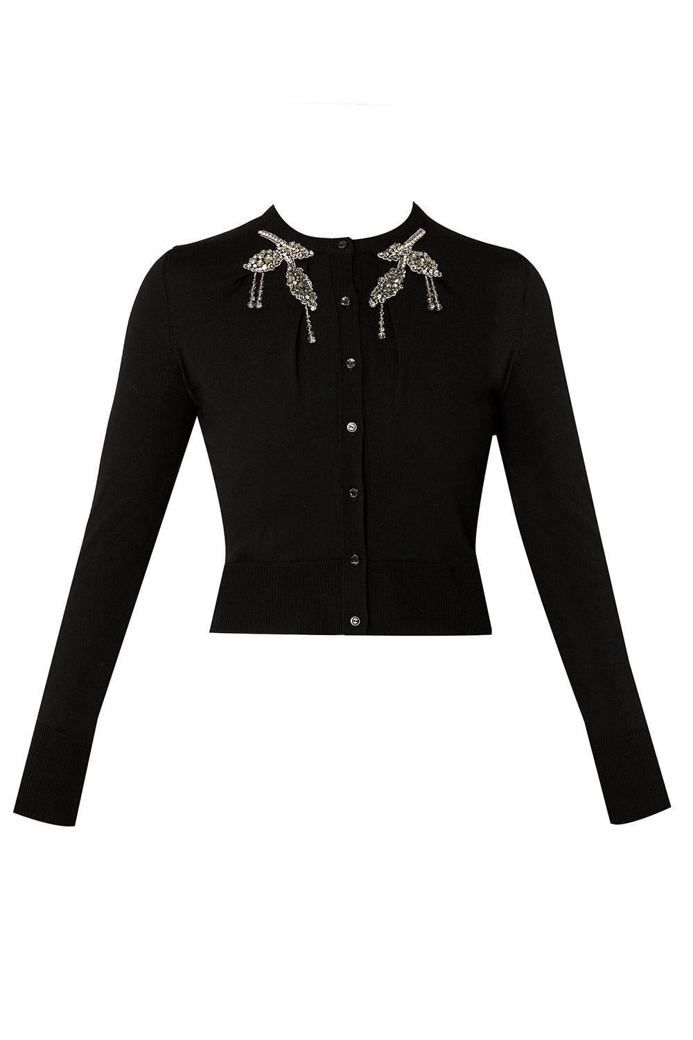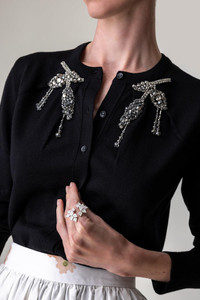 DETAILS AND INSIGHT Erdem embroidered cropped cardigan in black. F1: 100% MERINO WOOL EMB:70%GLASS,20%BRASS,5%METAL,5%PL Dry Clean Made in Romania Style PS25_KT9_BDWK-BLK