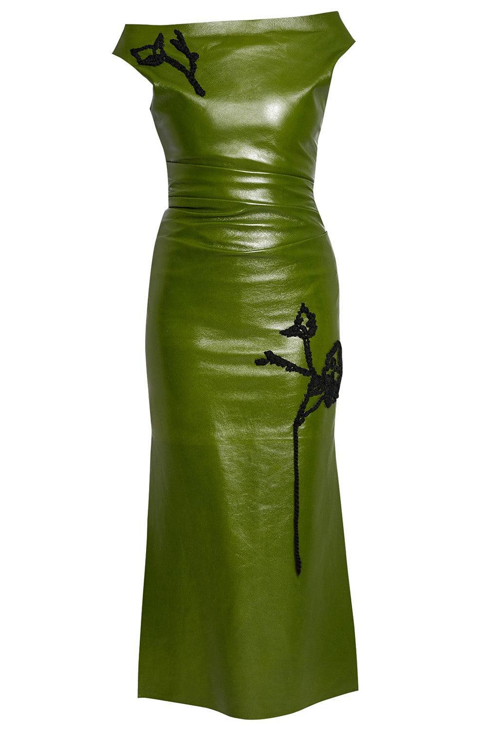 DETAILS AND INSIGHT Erdem embroidered pencil midi dress in moss green. M: 100% Sheep Leather, L: 100% Silk, E: 40% Wool 40% Pc 15% Pl 5% Pa Dry Clean Made In Italy Ships by Oct 7 Style AW25_LD1_10043010-MOSS GRN