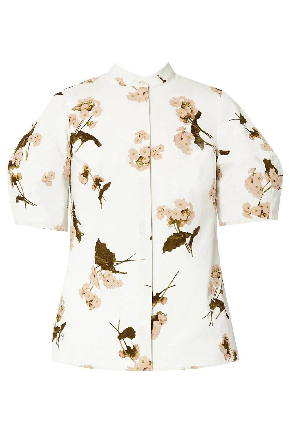 DETAILS AND INSIGHT Erdem short sleeve top in white. M: 100% COTTON LINING:100%COTTON Dry Clean Made in Moldova Style PS25_T17_WGCP-EG WHT