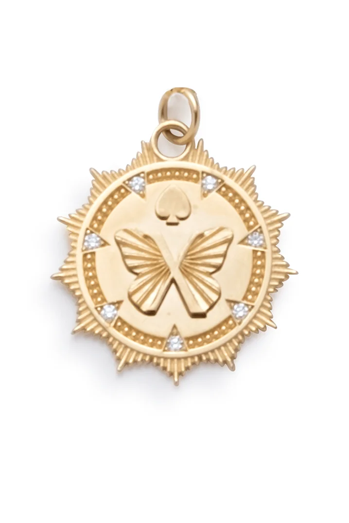 DETAILS AND INSIGHT Foundrae reverie medium medallion. Handcrafted in 18-karat Yellow Gold, this Medium Medallion represents Reverie. Reverie means daydreaming; floating between reality, fantasy, and memory. Connect your conscious and unconscious. Seek out what lights you up. Seek what gives you energy. Elevated positive energy is the catalyst of change that allows us to reconnect and align with our souls to create joy. These symbols evoke, rather than just describe, Joy. Diamond (0.08ctw) Measures: 22mm 18k Yellow Gold Style CM3-REVERIE