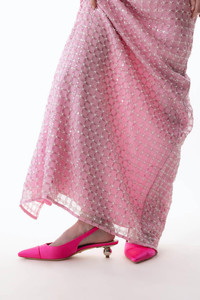 DETAILS AND INSIGHT Giambattista Valli slingback heel 35 in pink/crystal. SATIN FABRIC 100%SE SOLE:100%HIDE LEATHER (BOS TAURUS TAURUS) Heel Height: 35mm Made in ITALY Style 24FWKVLIS099-99SAT-4000