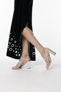DETAILS AND INSIGHT Gianvito Rossi strappy sandal in silver. 100% Lamb Leather Heel Height: 85m Made In Italy Style G32580-85RIC-NPS-ARGE