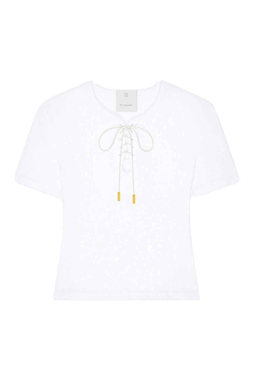 DETAILS AND INSIGHT Givenchy lace up t-shirt in white. 95% Cotton 5% Elastane Dry Clean Made In Italy Style BW70F1317P100
