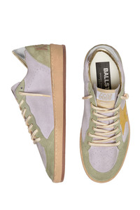 DETAILS AND INSIGHT Golden Goose ballstar spur sneaker in lilac/sage green/honey/silver. Upper-Cow Leather 96%; Goat Leather 4% - Lining-Cotton 34%; Cow Leather 31%; Polyurethane Textile 21%; Goat Leather 7%; Viscose 7% - Sole-Rubber 100% Made In Italy Pre-Order Ships by Feb 7 Style GWF00117.F008145.83251