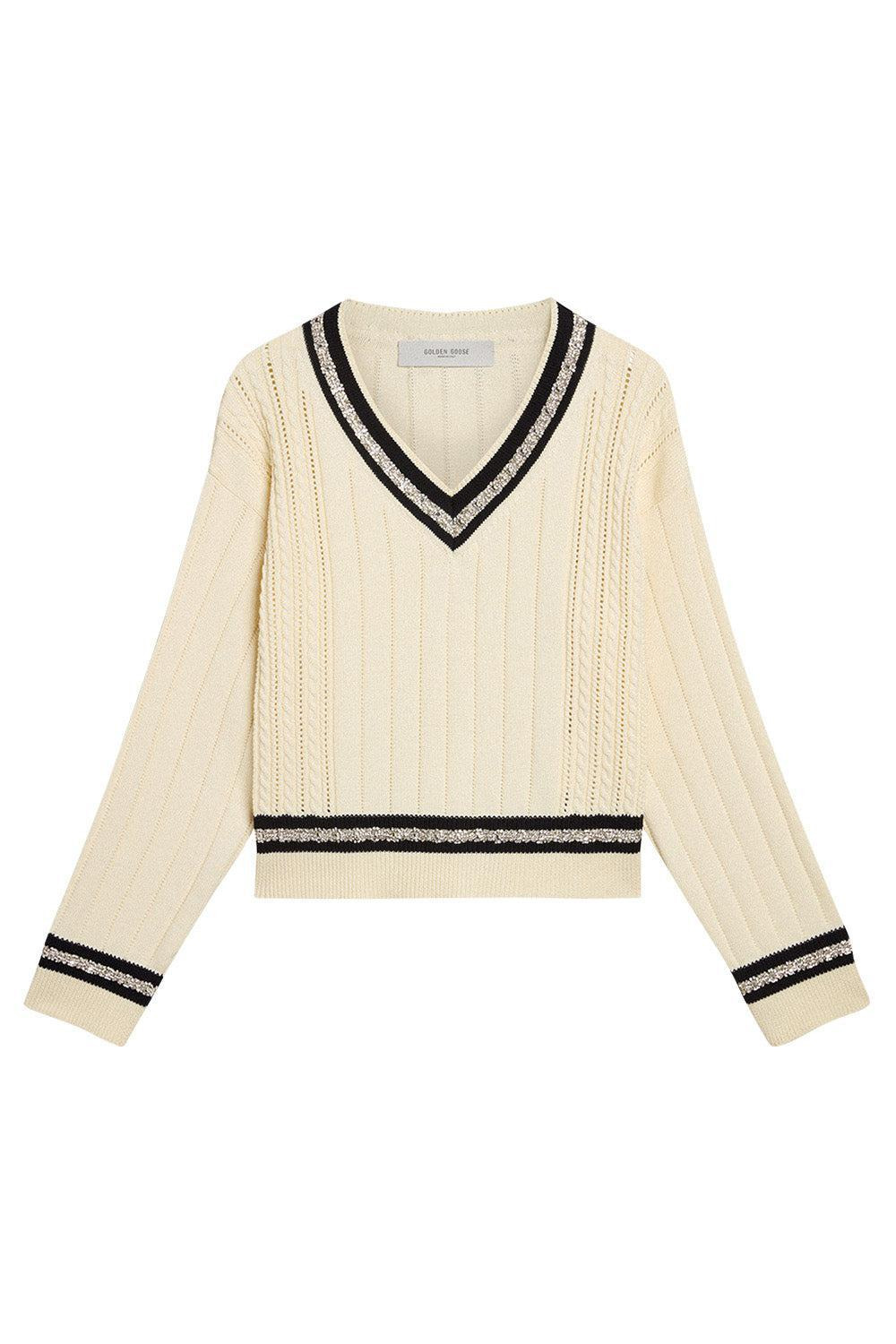 DETAILS AND INSIGHT Golden Goose golden w's marla vneck in heritage white/dark blue. Cotton Dry clean Made in Italy Style GWP02120.P001912.11782