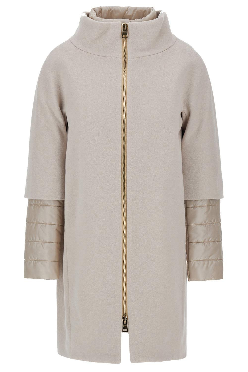 DETAILS AND INSIGHT Herno luxury wool herno cocoon coat in light beige. Main Fabric: 100% Virgin Wool Secondary Fabric: 100% Polyamide / Nylon Lining: 100% Polyamide / Nylon Padding (Fiber): 100% Polyester Trimming: 55% Cotton 45% Polyester Do Not Wash / Do Not Bleach / Do Not Tumble Dry / Ironing Low Temperature - Without Steam / Dry Cleaning In Any Solvent - Mild Process Made In Italy Style CA000544D-33313-1980