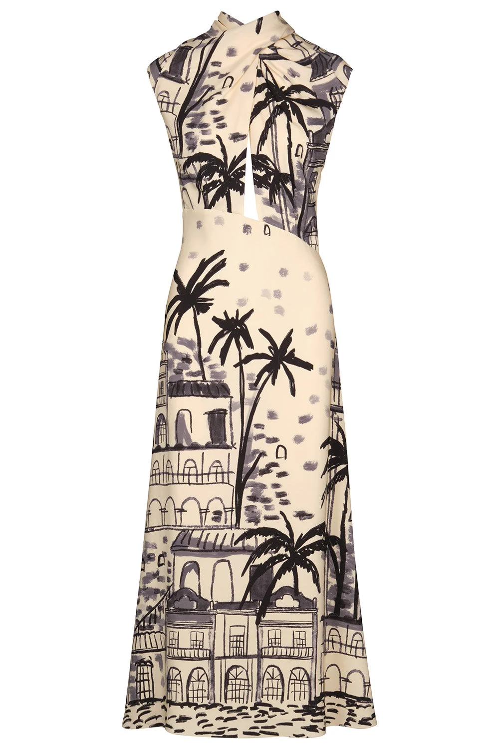DETAILS AND INSIGHT Johanna Ortiz interdimensional dress in ecru / black. 100% Silk Dry Clean Made In Colombia Pre-Order Ships By Jan 7 Style PT03607-ECRU/BLK