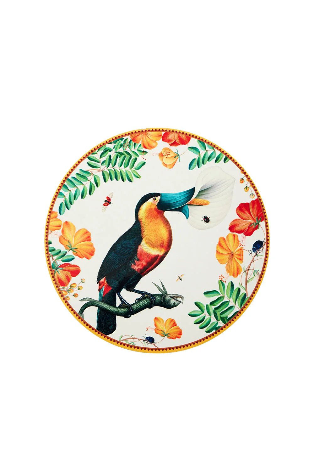 DETAILS AND INSIGHT La DoubleJ disk placement in floroucan ivory. The best table settings start with a stellar foundation. These highly decorative Disk Placemats made from compressed, durable, natural materials make for a stunning statement on any table. Adorned with the fabulous Floroucan from our Fantastic Creatures Collection with surrealist artist, Beto Val, this placemat not only elevates your tablescape, but your energy also, designed to activate your throat chakra and ignite your inner megaphone (perfect for those toasts you'll be giving at your fantastic festa!). 83% Wood fiber 12% Cork 5% Polyester 34cm D Made in Italy Style PMT0016_CRK001FLC01_WH04