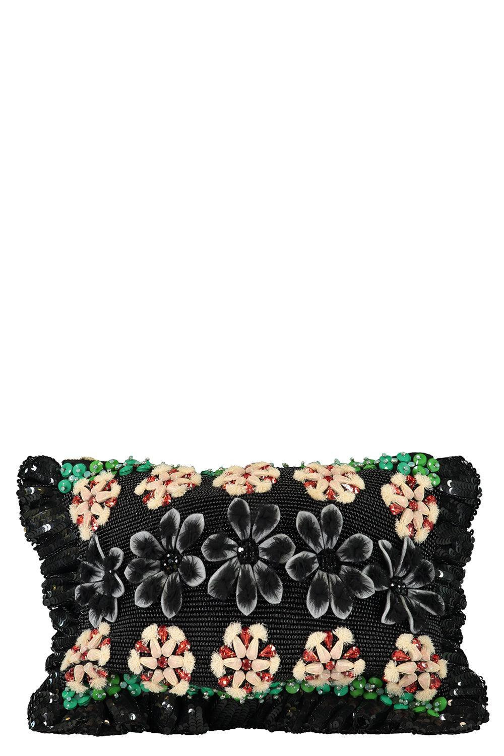 DETAILS AND INSIGHT La Doublej embroidered hand pochette in bloomy. 70% Viscose 9% Plastic 8% Glass 7% Metal 4% Acrylic 2% Cotton Dry Clean Made In India Style BAG0081_EMB108MXF02_BL01