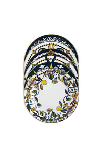 DETAILS AND INSIGHT La DoubleJ set of 6 dessert plates in vesuvio. Whether you're dining with two or a few, our set of six porcelain Dessert Plates are fabuloso at kick-starting conversations when it comes to the end of a meal. This collection is inspired by one of Italy’s most iconic cities, Napoli, and, with its Mediterranean blues, greens, geometrics and florals, it is guaranteed to bring adoration to your table from whoever dines at it. Crafted by our historic Italian porcelain partners with hand painted gold rims, these plates are as great for puddings as stashing your crystals and go in the dishwasher, too. Also: hello, hero wedding gift! Italian-made fine porcelain, Hand-painted 18K gold trim Set of 6 plates in various prints Dishwasher Safe Gentle Wash 20 x 20cm Made in Italy Style DES0006_CER001VSV01_MU03