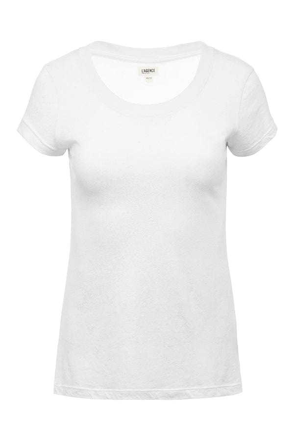 DETAILS AND INSIGHT L'Agence cory short sleeve crew neck tee in white. 100% Cotton Dry Clean Made in the United States Style 5484DCJ-WHITE