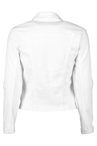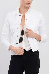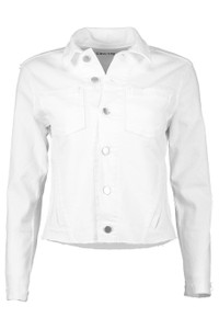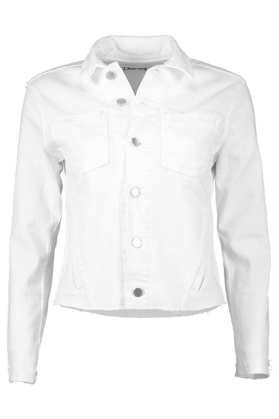DETAILS AND INSIGHT White raw hem denim jacket from L'Agence featuring a slim fit, spread collar, button down front, long cuffed sleeves, patch and side pockets, and a straight raw hem. 98% Cotton, 2% Elastane, Machine Wash Made in the USA, Standard Sizing Style 1431KBO-BLAN
