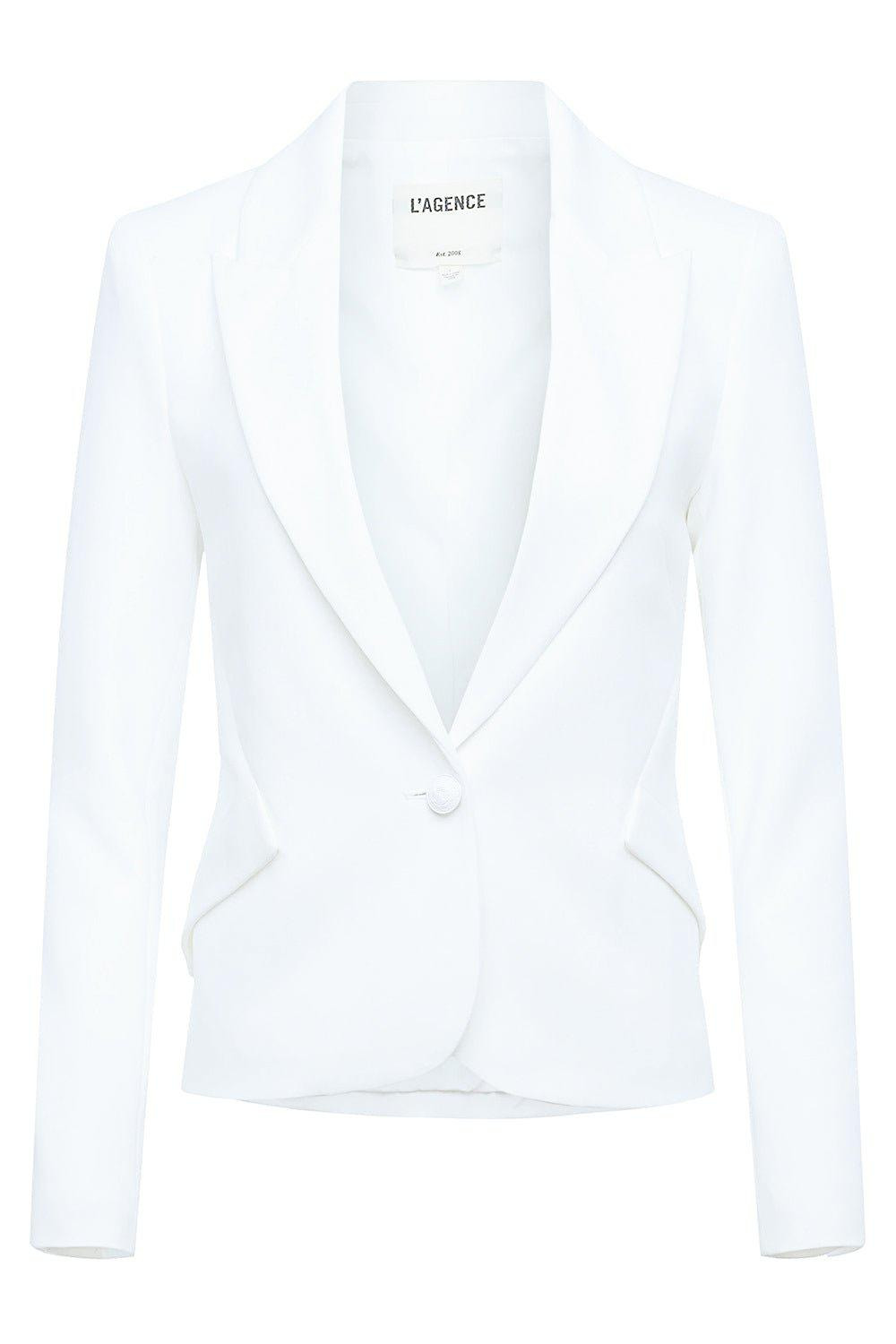 DETAILS AND INSIGHT L'Agence jennah blazer in ivory. 73% Polyester 20% Viscose 7% Spandex Dry Clean Imported Style 1664PMB-IVOR