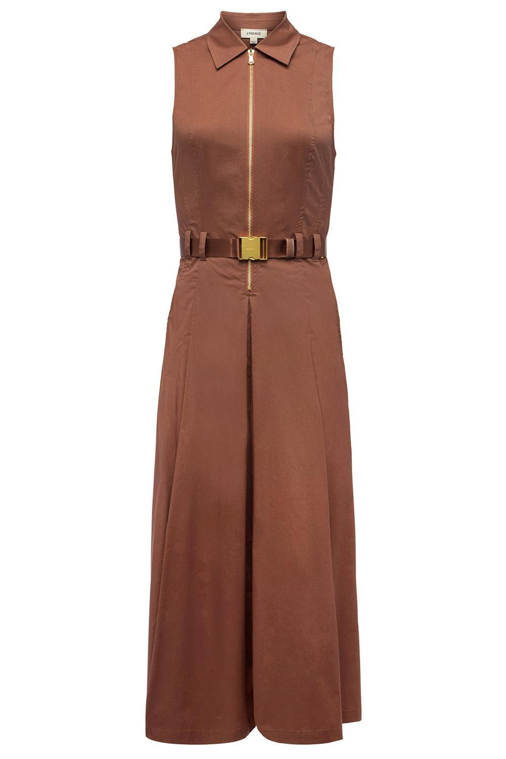 DETAILS AND INSIGHT L'Agence kolton midi dress with belt in sepia brown. 62% Cotton 35% Nylon 3% Spandex Dry Clean Only Made In China Style 61611LCN-SPBR