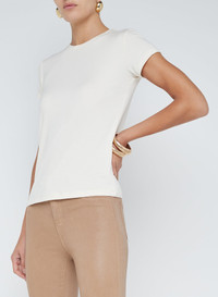 DETAILS AND INSIGHT L'Agence ressi tee in vintage white. 93% RAYON, 7% SPANDEX Dry clean Made in USA Style 5507MJT-VIWH