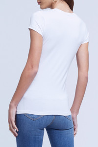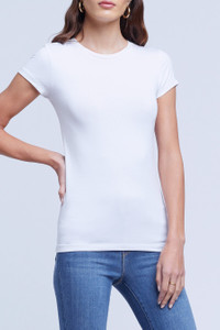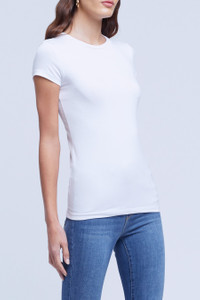DETAILS AND INSIGHT L'agence ressi tee in white. 93% Rayon, 7% Spandex Dry Clean Constructed in US of Imported Materials Style 5507MJT-WHIT