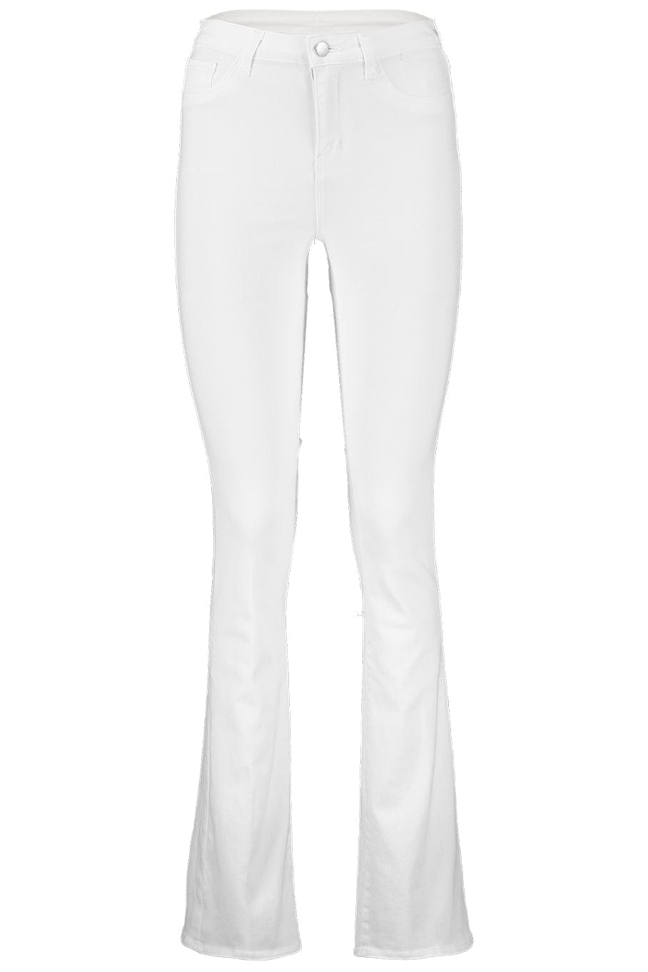 DETAILS AND INSIGHT A classic high-rise jean in white premium stretch denim. Contoured waistband fits securely just above the natural waist, while the design hugs from hip to knee before releasing into a slim bootcut hem. High-recovery denim holds its shape, smoothing the figure without sacrificing comfort. Classic five-pocket construction and zip fly closure. 86% Cotton, 11% Elastane, 3% Spandex Made in USA Style 2700PDD