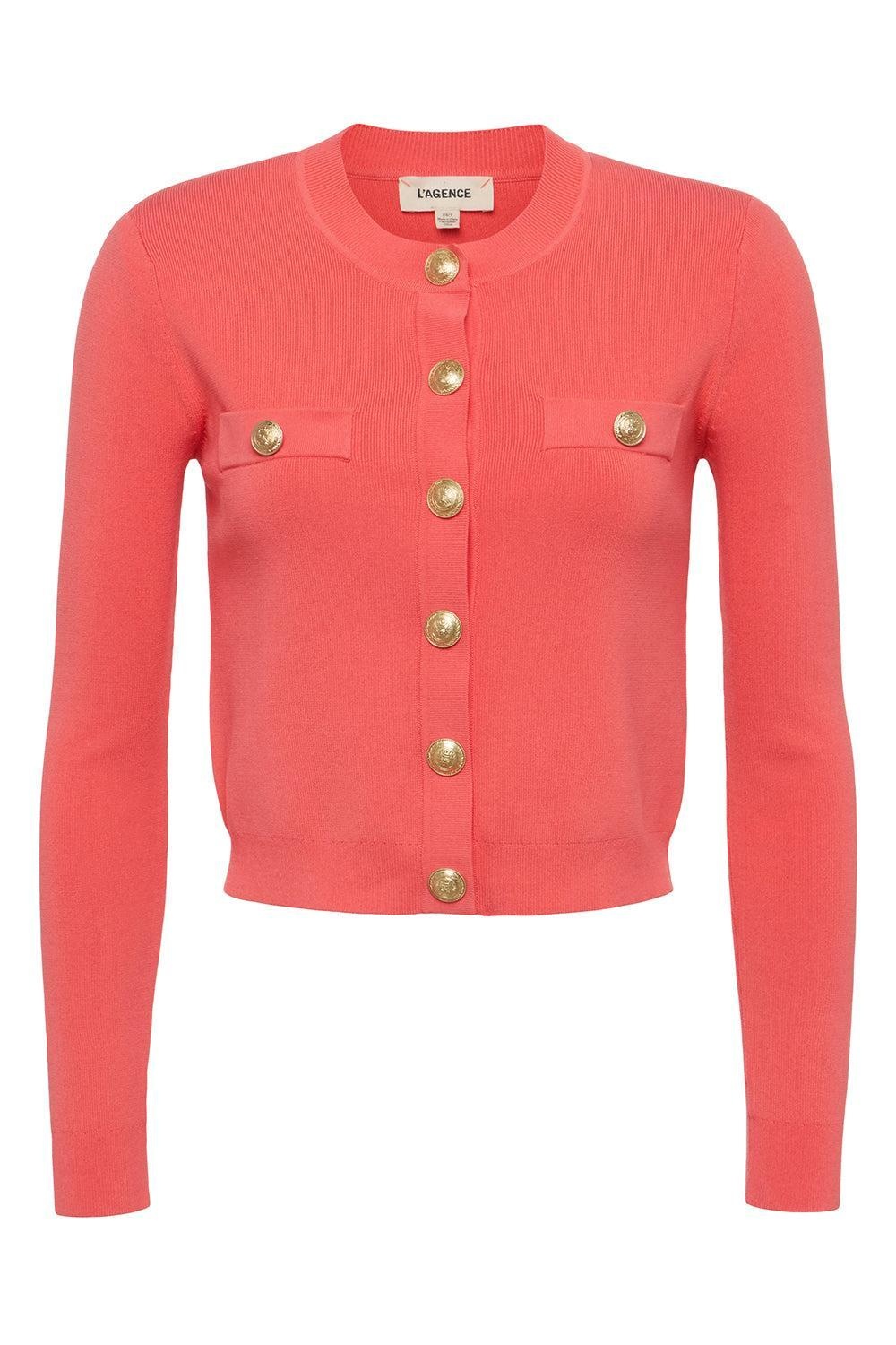 DETAILS AND INSIGHT L'Agence toulouse cardigan in coral rose/gold. 55% Rayon 43% Nylon 2% Spandex Dry Clean Made In China Style 8928NXC2-CRLG