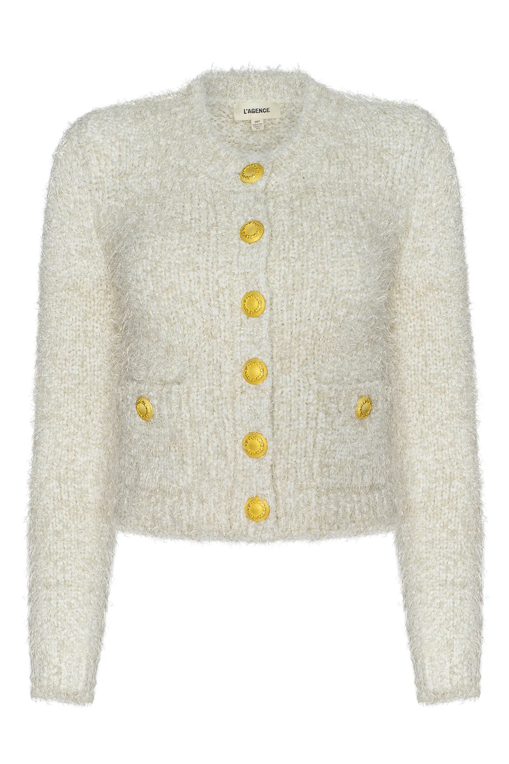 DETAILS AND INSIGHT L'Agence una knit cardigan in ivory/gold lurex multi. 1% Spandex,15% Cotton 11% Nylon 4% Lurex,44% Polyester 25% Acrylic Dry Clean Only Cover Button With Foil Paper No Bleach No Tumble Dry Cool Iron On Reverse When Needed Made In China Style 80045FZY-IGLX