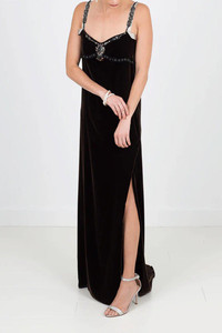 DETAILS AND INSIGHT Velvet Beaded Detail Gown From Lanvin Form-Fitting, Velvet Gown With Glass Bead Detailing On Shoulders And Chest 74% Viscose, 26% Silk Dry Clean Made in France Available in Brown Style 2340051