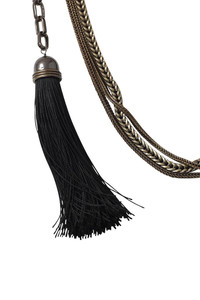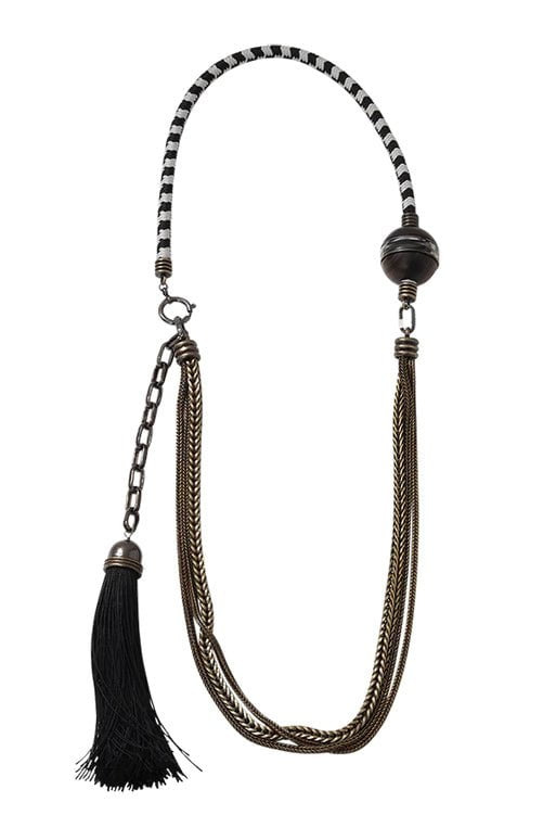 DETAILS AND INSIGHT Vita Long Tassle Necklace From Lanvin 52" Adjustable Length And 1.5" Width Spring Clasp Closure Tassle, Brass Chains, And Bungee Rope Detailing Available In Black Style AWCJHA6H-DARK