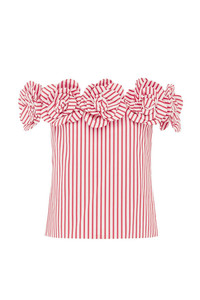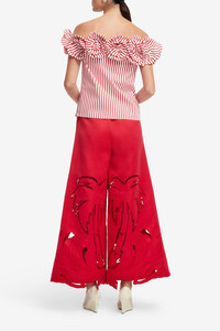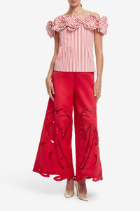 DETAILS AND INSIGHT Leo Lin mckayla top in stripes in scarlet. 100% Polyester / Slip: 95% Polyester 5% Spandex Dry Clean Made In China Style LLRE26015-SCARLET STRIPE