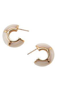 DETAILS AND INSIGHT Lizzie Fortunato pearl zellige hoop earrings in white. The Design Team Took Inspiration From The Traditional Glazed Zellige Tiles Handcrafted In Morocco And Created These Hoops, Our Freshest New Silhouette In Gold-Plated Brass With A Luminous Mother-Of-Pearl Stone Inlay. Gold-Plated Brass Mother-Of-Pearl 1" Style R26-E003