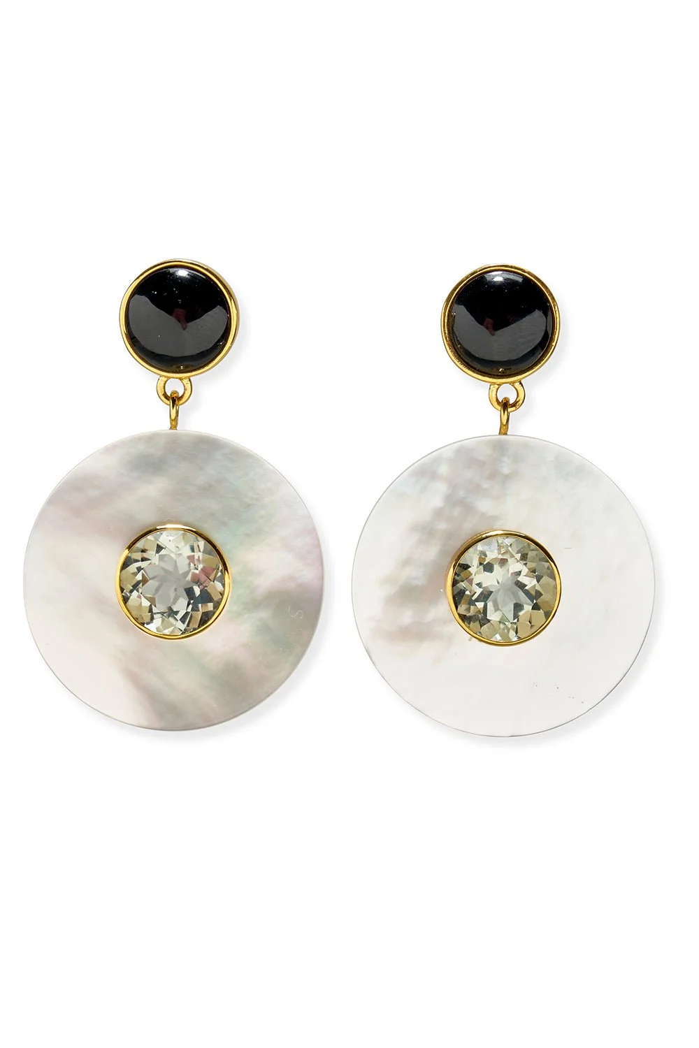 DETAILS AND INSIGHT Lizzie Fortunato taj disc earrings in pearl. Gold Plated Brass mother-of-pearl, black agate, green amethyst 1.5" L Style FW24-E020