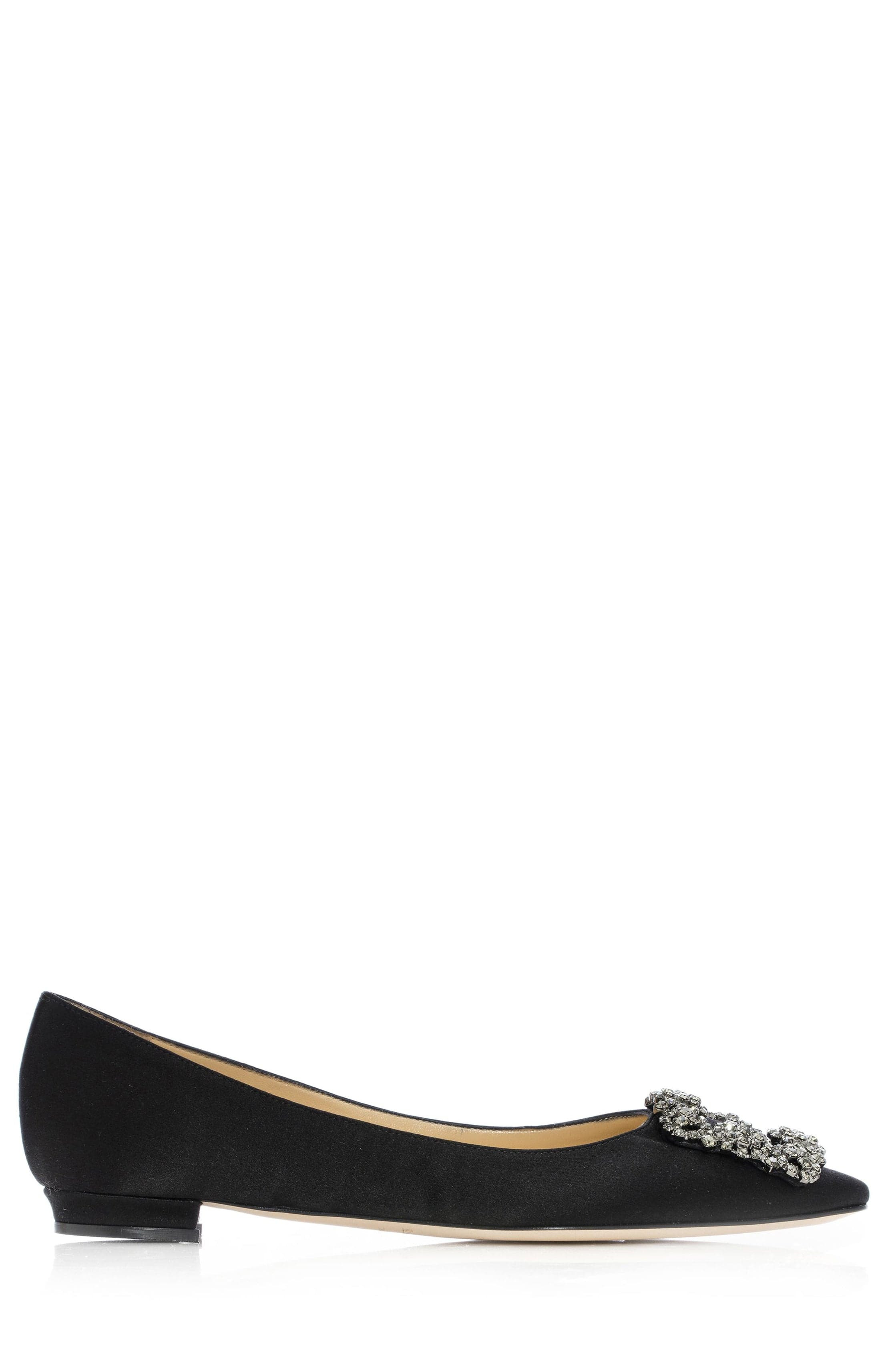 DETAILS AND INSIGHT Manolo Blahnik hangisi flat in black. 10mm 100% Satin Upper 100% Leather Sole Made in Italy Style 9XX-0347-0015