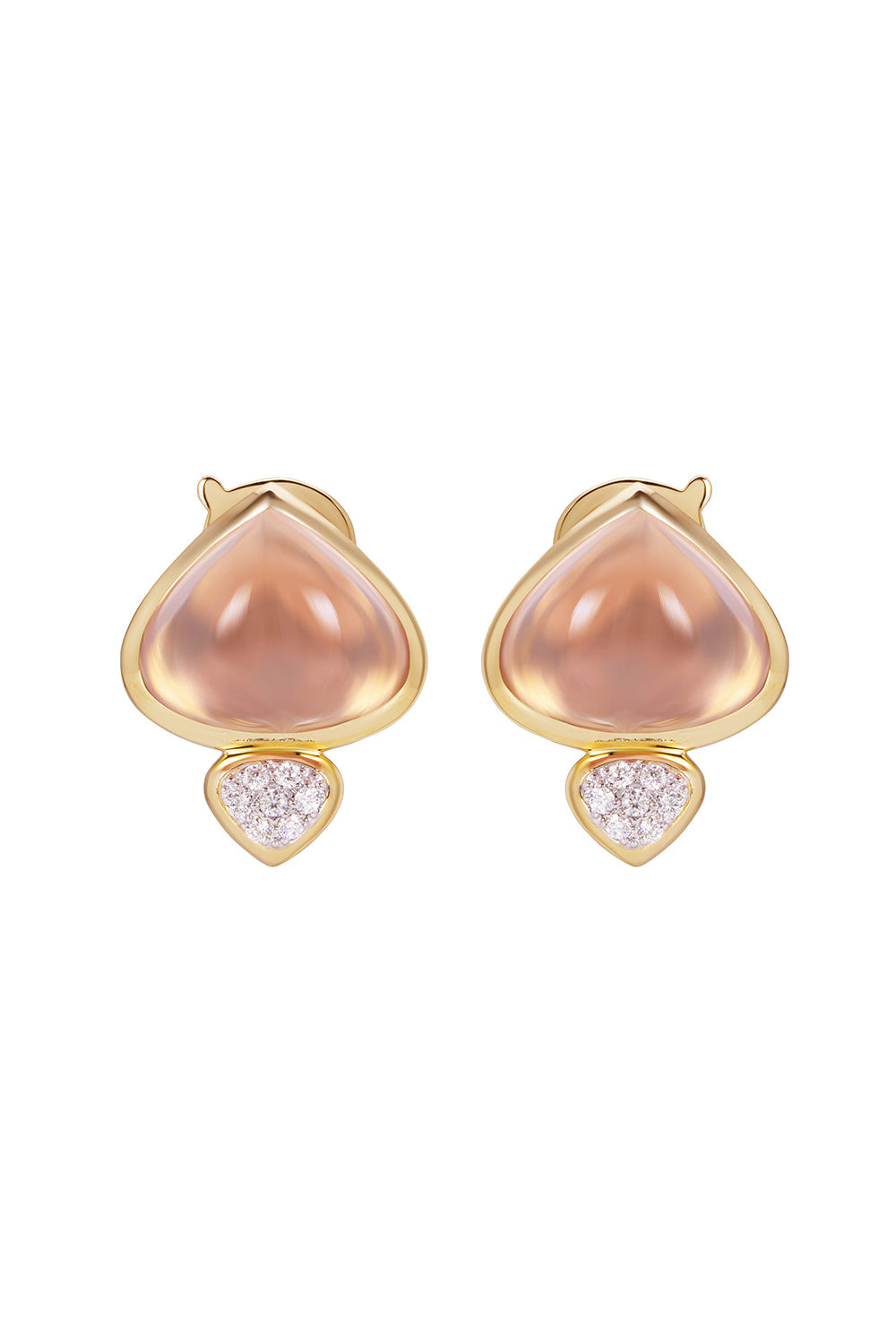 DETAILS AND INSIGHT Marina B rose quartz diamond trisolina earrings in yellow gold. 18K Yellow Gold Cabochon Rose Quartz 8.26Cts, Pave Diamonds 0.12Cts Style EATM-08YDRQ