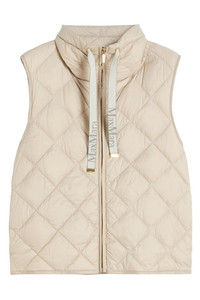 DETAILS AND INSIGHT Max Mara puffer vest in sand. 100% Polyamide Machine Wash Cold Made In Am Pre-Order Ships by March 3 Style 2619291014600-SAND