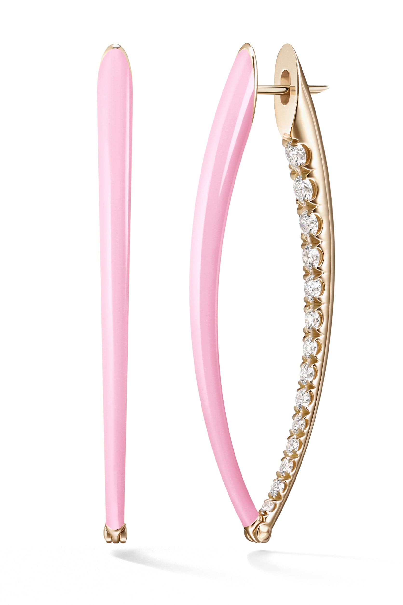 DETAILS AND INSIGHT Melissa Kaye 18k gold earrings with diamonds and Marissa Pink enamel. Hinged hoop with post back Diamond (0.92ctw) 42mm length 18k Gold *Color exclusive "Marissa Pink" is a custom order, 3-4 production lead time. None